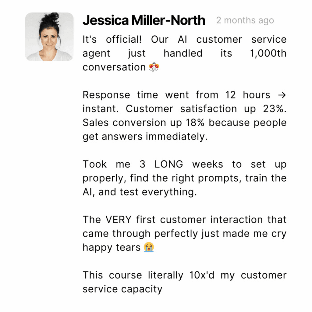 ❌ Customer service nightmare – You’re either drowning in support tickets yourself or paying $15-$25/hour for support staff who might miss messages, give inconsistent answers, or quit right when you need them most.