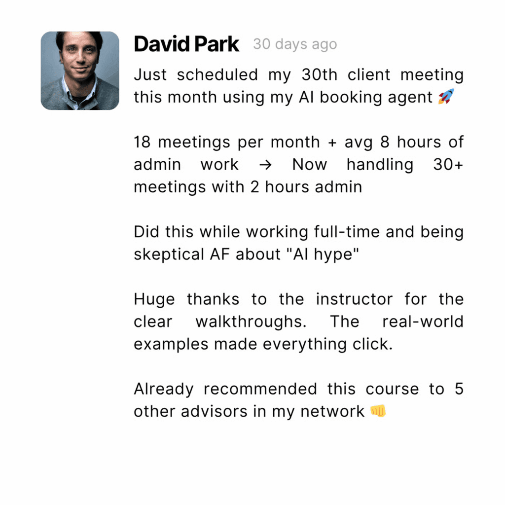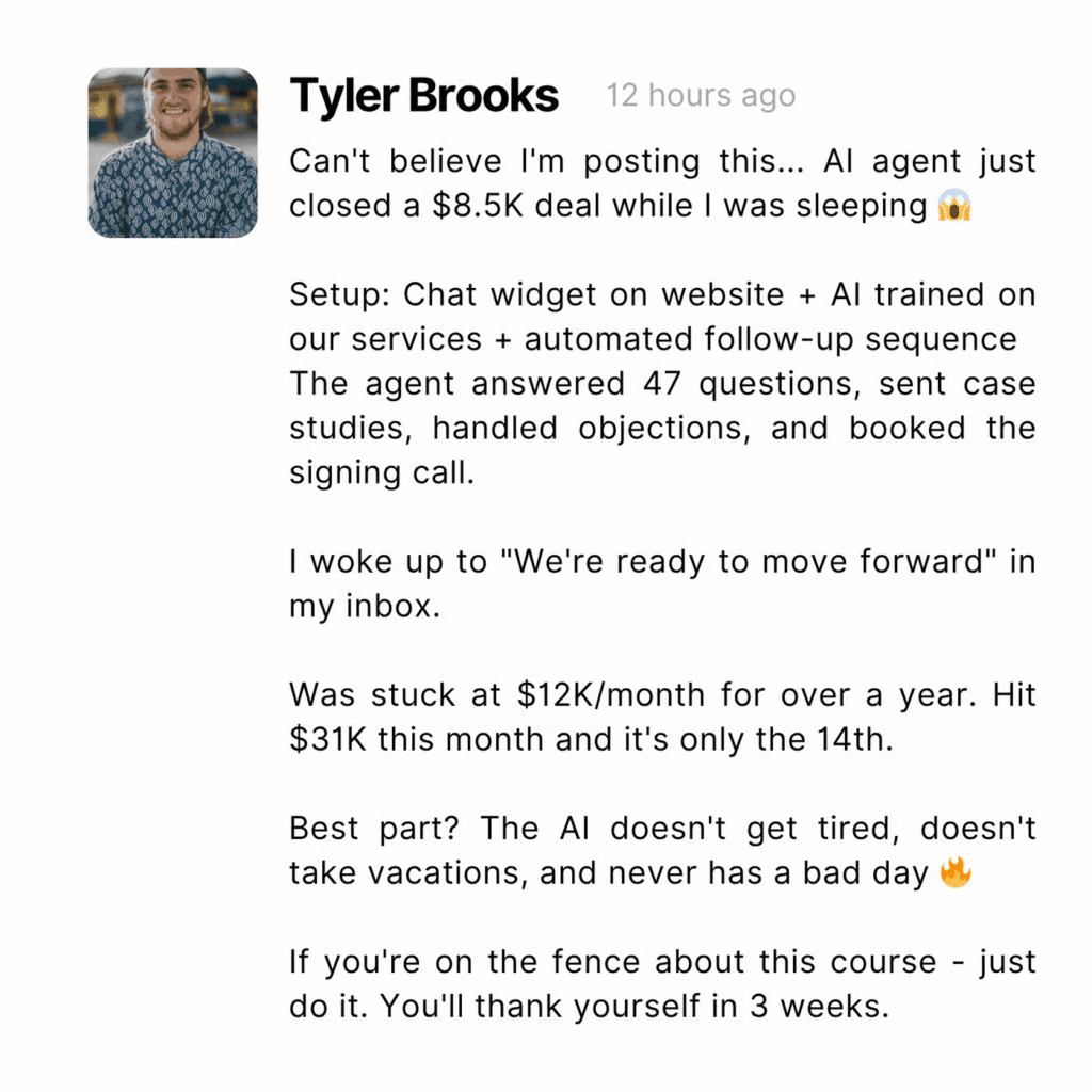 ​You Build It WITH Us, Not By Yourself – This isn’t “watch these videos and figure it out.” We’re building these AI agents together in trainings and showing you prebuilt ones you can implement in less than 30 min. You just follow along.